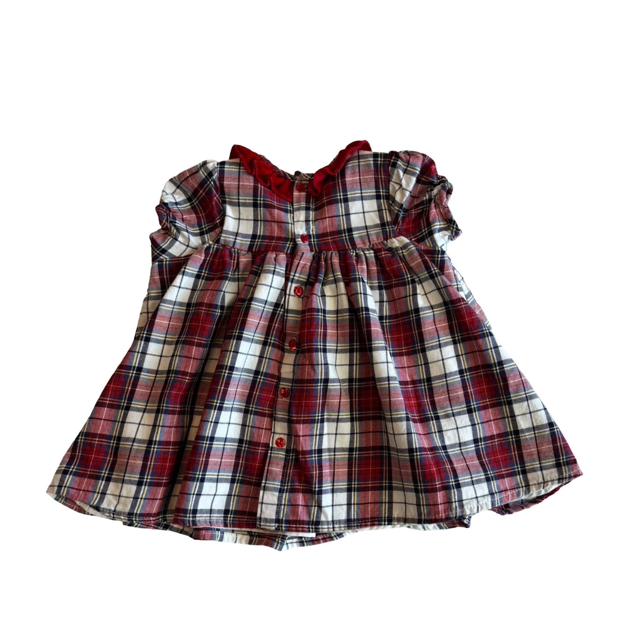 A classic red tartan dress with soft gathers and a traditional holiday palette. A picture-perfect choice for December festivities