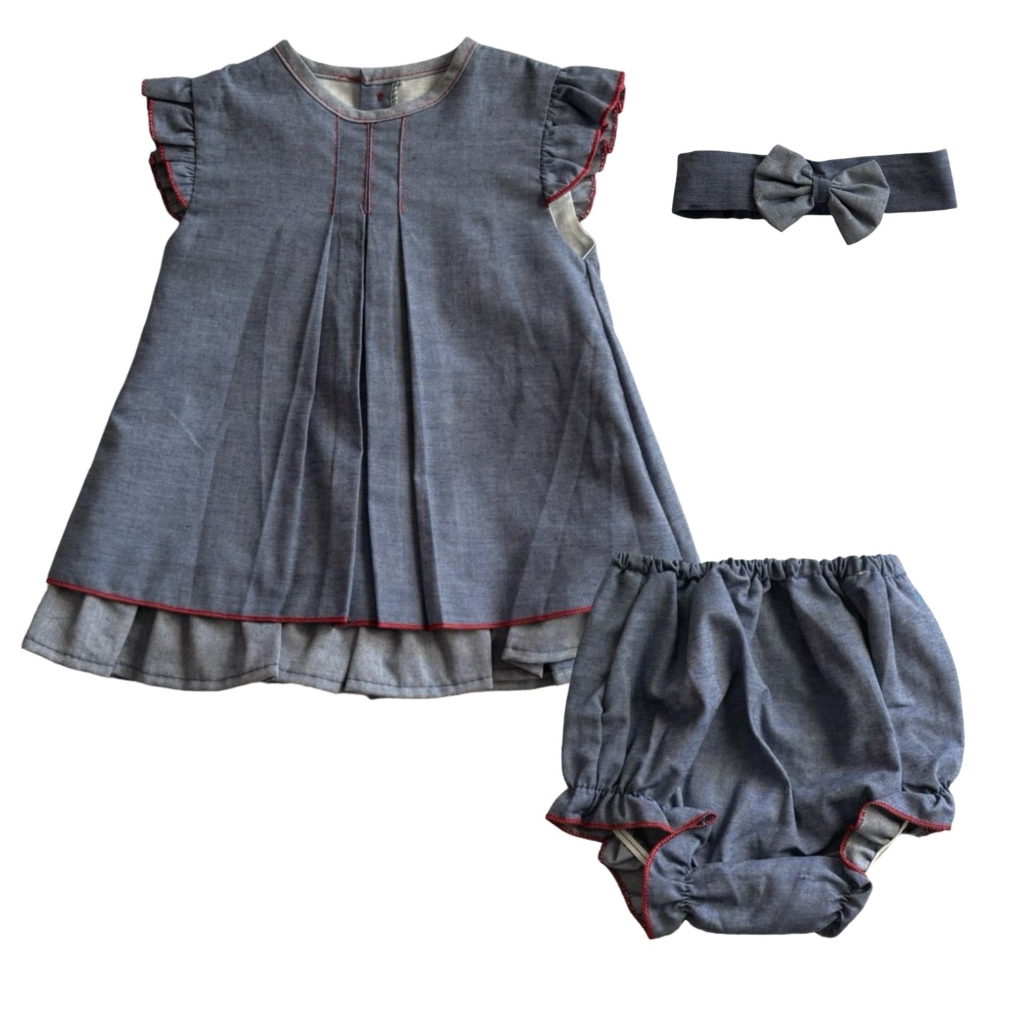 A beautifully crafted Baby Ferr set featuring a blue dress with delicate pleating and subtle red pipping. Paired with coordinating bloomers and headband, this ensemble captures the charm of traditional Spanish childrenswear - refined, airy, and perfect for special occasions.