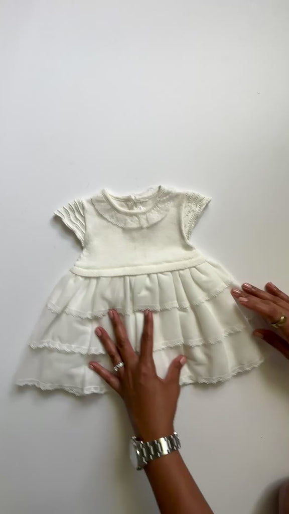 An exquisite ivory dress by Mayoral, combining a soft knit bodice with delicate lace trim and a layered tulle skirt. Featuring short sleeves, a rounded collar with subtle detailing, and tiered lace edging for a graceful finish. Buttons down the back ensure easy dressing, making this piece perfect for special occasions or cherished moments.