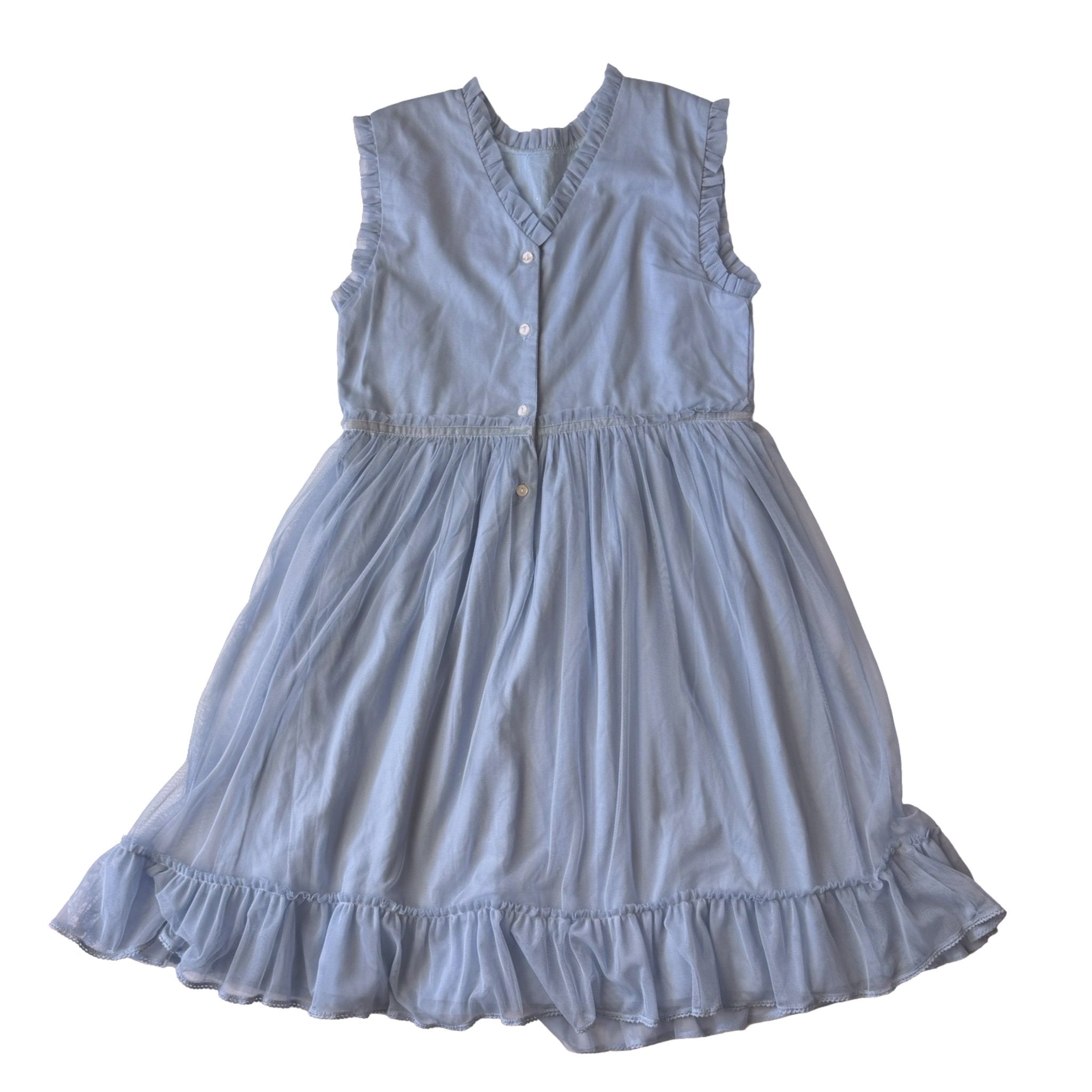 Elegant and ethereal, this dress by Patricia Mendiluce mirrors the delicate beauty of its baby counterpart that’s available in 18 months. Crafted in soft powder blue with a light tulle overlay and ruffled trim, it evokes effortless grace and timeless charm. Perfect for matching sibling moments, portraits, and special celebrations, this Spanish-made piece captures the essence of refined simplicity and sisterly elegance. Fully lined for comfort