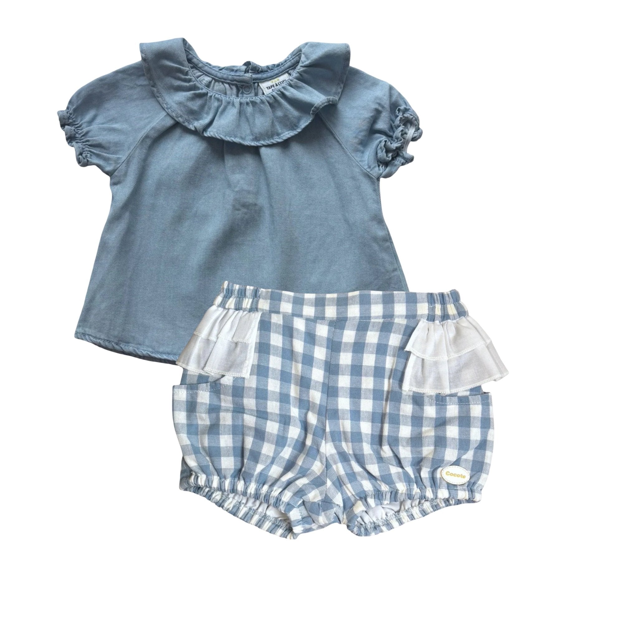 A sweet denim top from Tape à l’Oeil brings ruffled charm with puffed sleeves and an easy button back for all day comfort. Paired with Cocote’s traditional white and blue gingham bloomers, lined in soft cotton with delicate ruffles and a gentle elastic fit, this set feels classic and effortlessly cute.