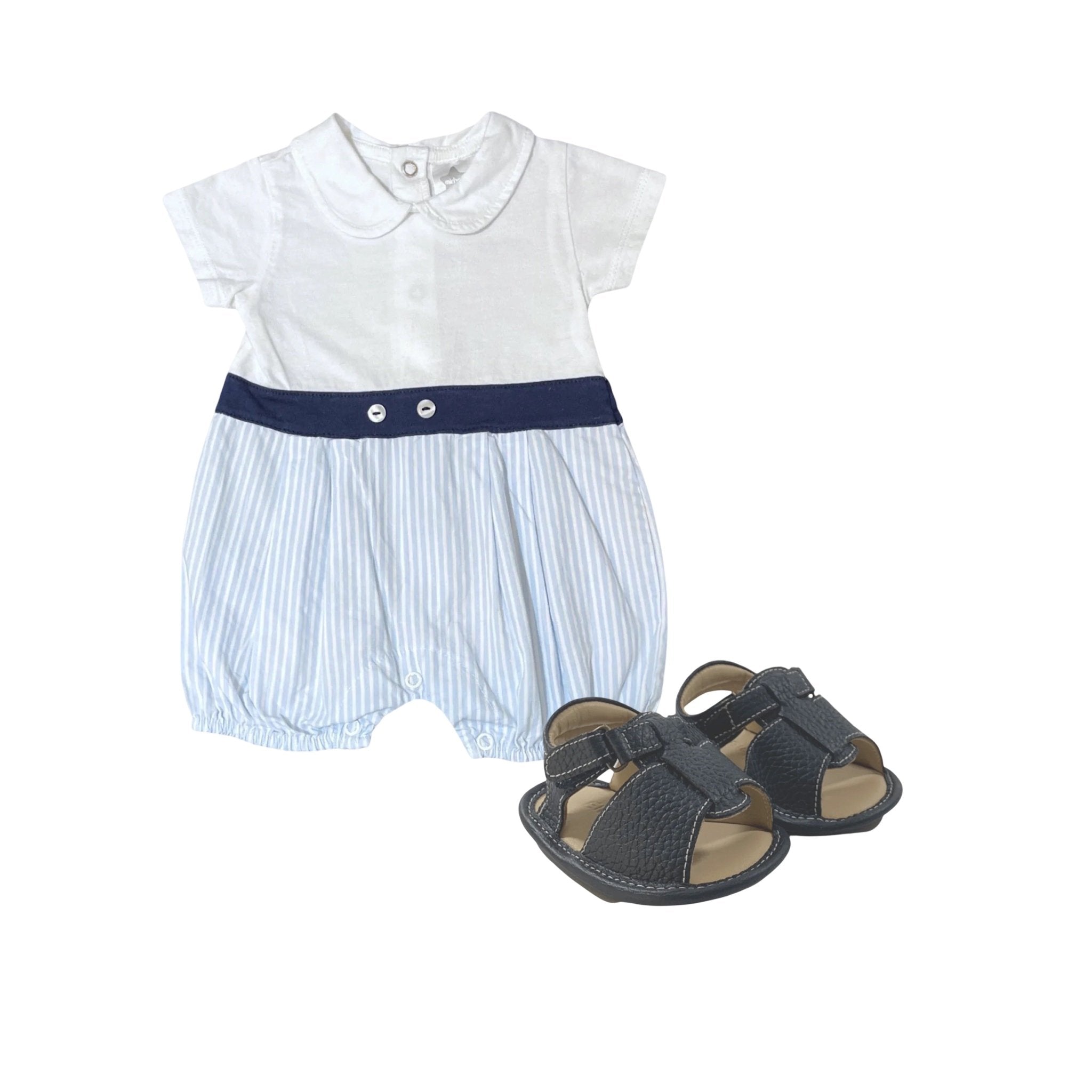 A charming Minhon baby romper crafted in soft, breathable cotton pairs its sweet striped bottom with all-day comfort, complete with easy snap closures. Matched with classic navy Elephantito strap sandals, handmade in natural materials, this preloved duo brings a timeless, modern touch to your little explorer’s everyday adventures.