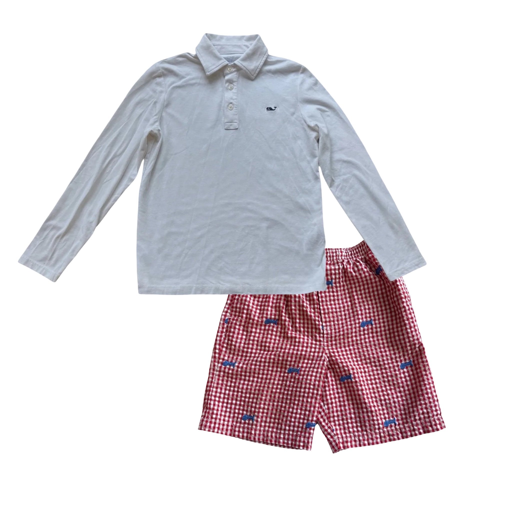 A soft long sleeve polo from Vineyard Vines brings refined comfort with its Pima cotton feel and signature whale logo. Paired with cheerful red gingham shorts from Kelly’s Kids, complete with embroidered fish skeletons and an easy elastic waist, this set mixes classic polish with sunny day fun. Both pieces are in great preloved condition.