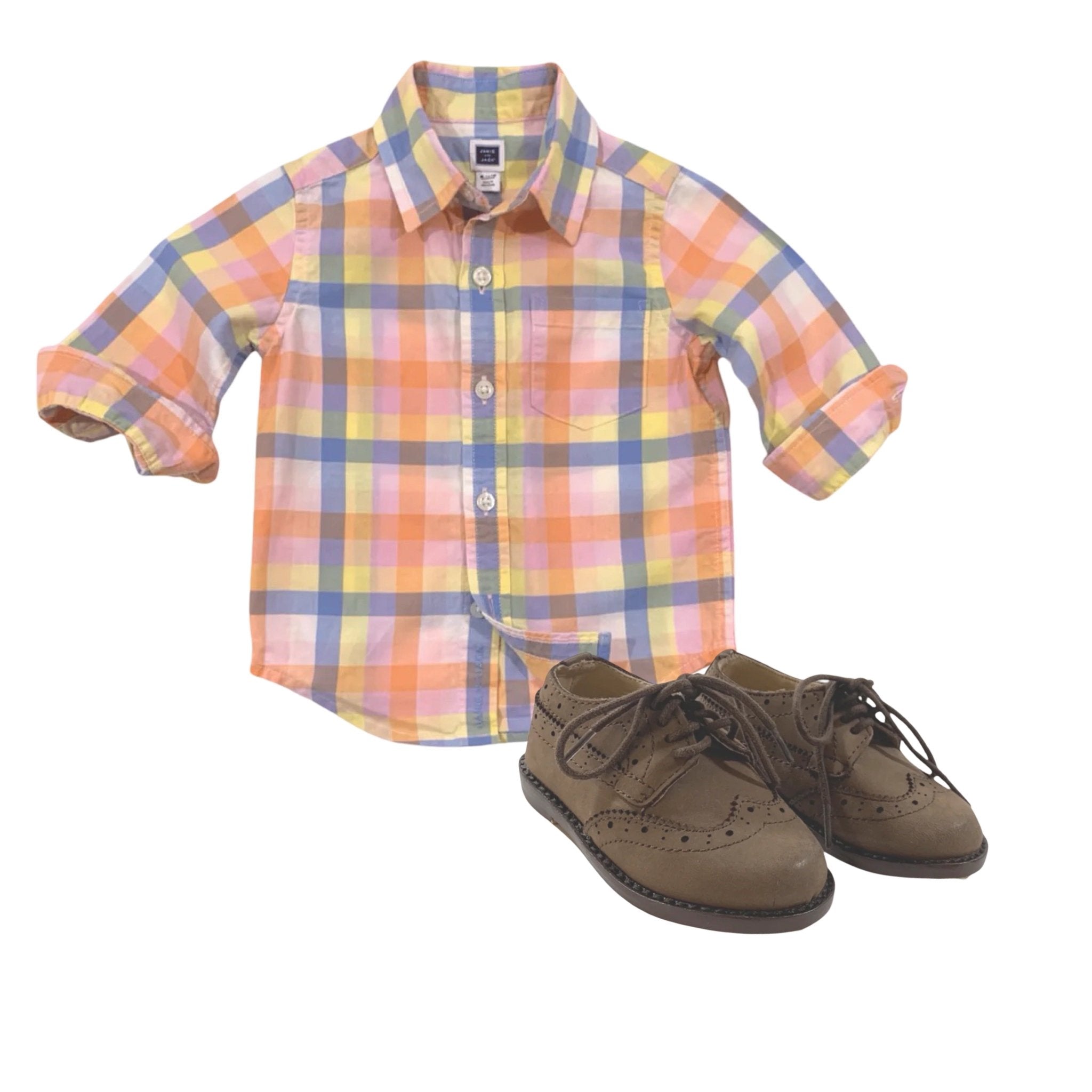 A crisp Janie and Jack plaid poplin shirt in soft pastel tones adds easy charm and feels especially sweet for spring. Paired with classic leather wingtip oxfords from the same brand, this preloved set brings a polished, timeless touch to any little wardrobe. Perfect for mixing, matching, and elevating everyday style.
