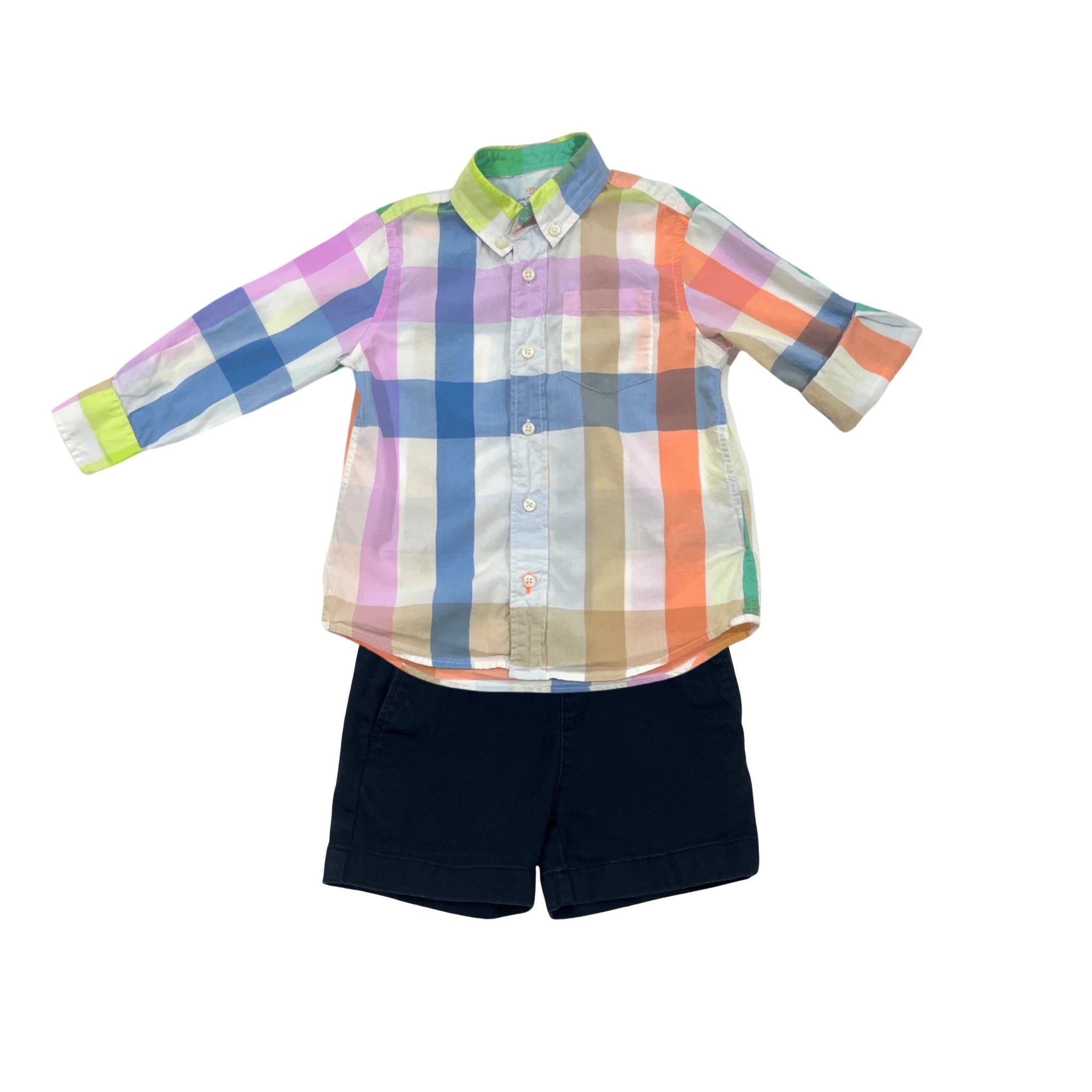A crisp cotton button up from CrewCuts pairs effortlessly with their navy cotton shorts for an easy classic look. The shirt brings simple charm while the shorts offer a comfortable adjustable waist and practical pockets. Both pieces are in great preloved condition.