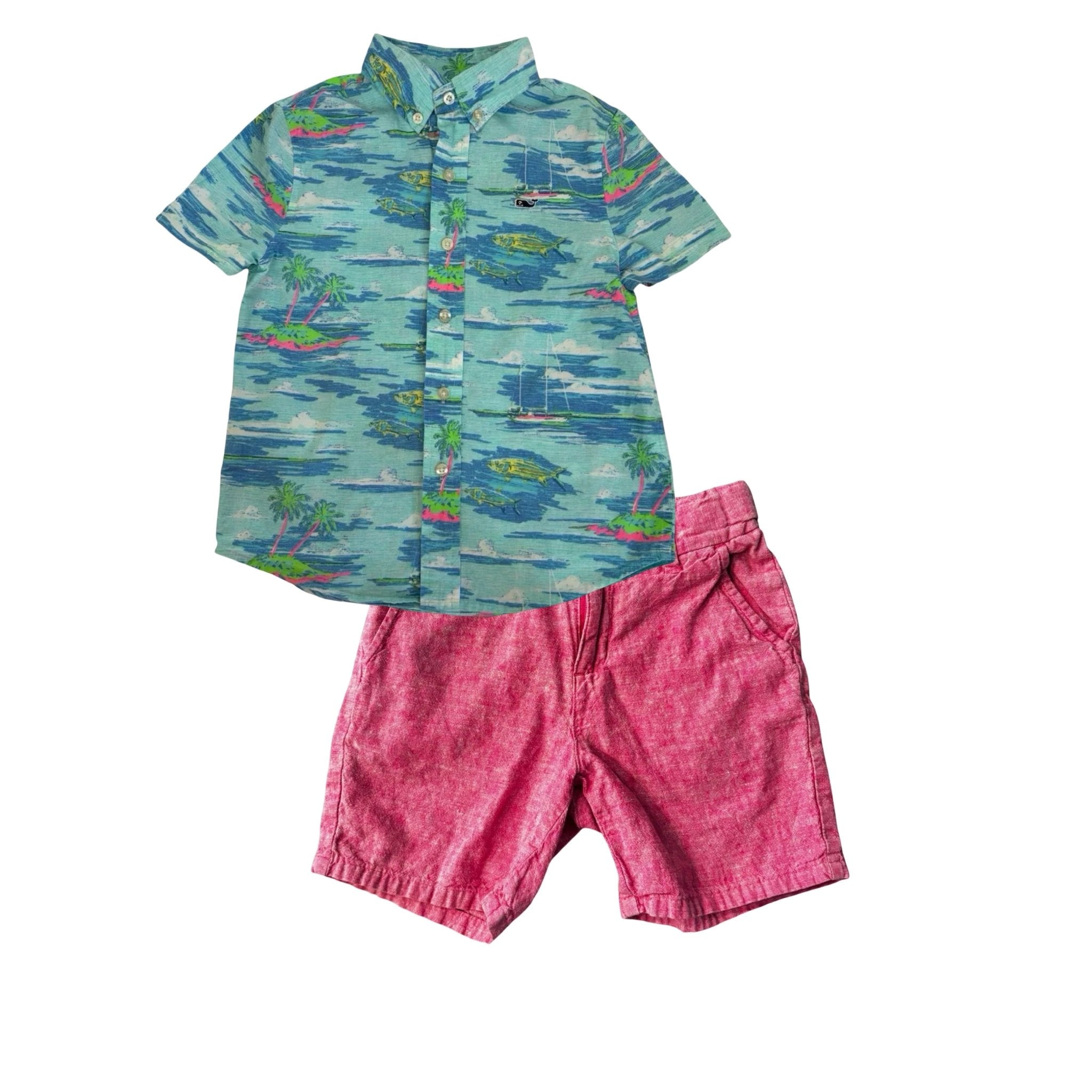 A lightweight Vineyard Vines short sleeve button down brings effortless resort charm with its crisp cotton feel and signature pink whale at the chest. Paired with Janie and Jack linen shorts that offer an adjustable waist and easy tailored details, this set feels relaxed yet refined. Both pieces are in great preloved condition.