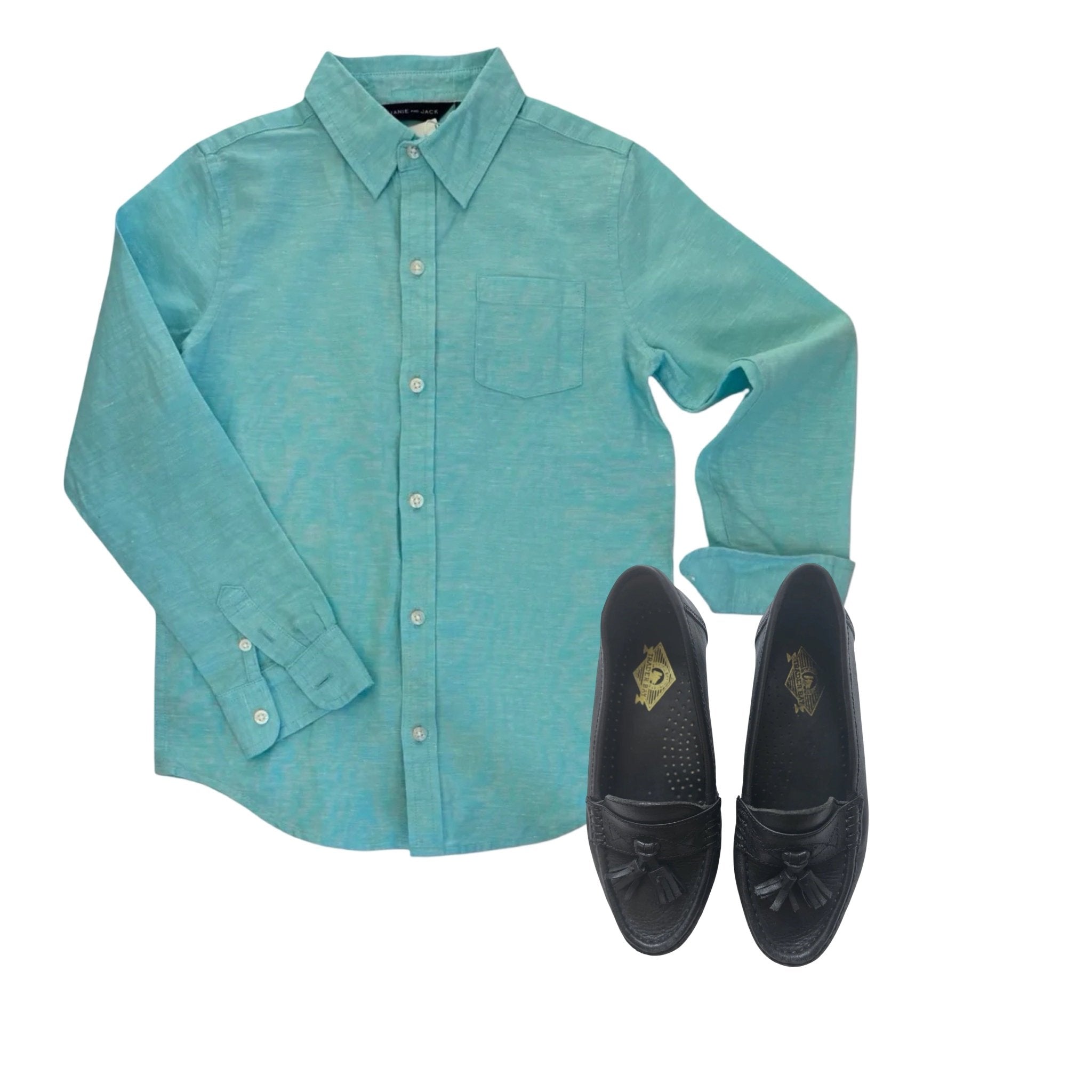 A timeless cotton linen button up from Janie and Jack brings soft elegance in a subtle turquoise tone that feels fresh and effortlessly stylish. Brand new with tags, it pairs beautifully with classic black leather loafers featuring tassel trims and refined stitched details. This preloved pair adds a polished finishing touch and captures the Monaco mood with a look that feels relaxed yet perfectly put together.