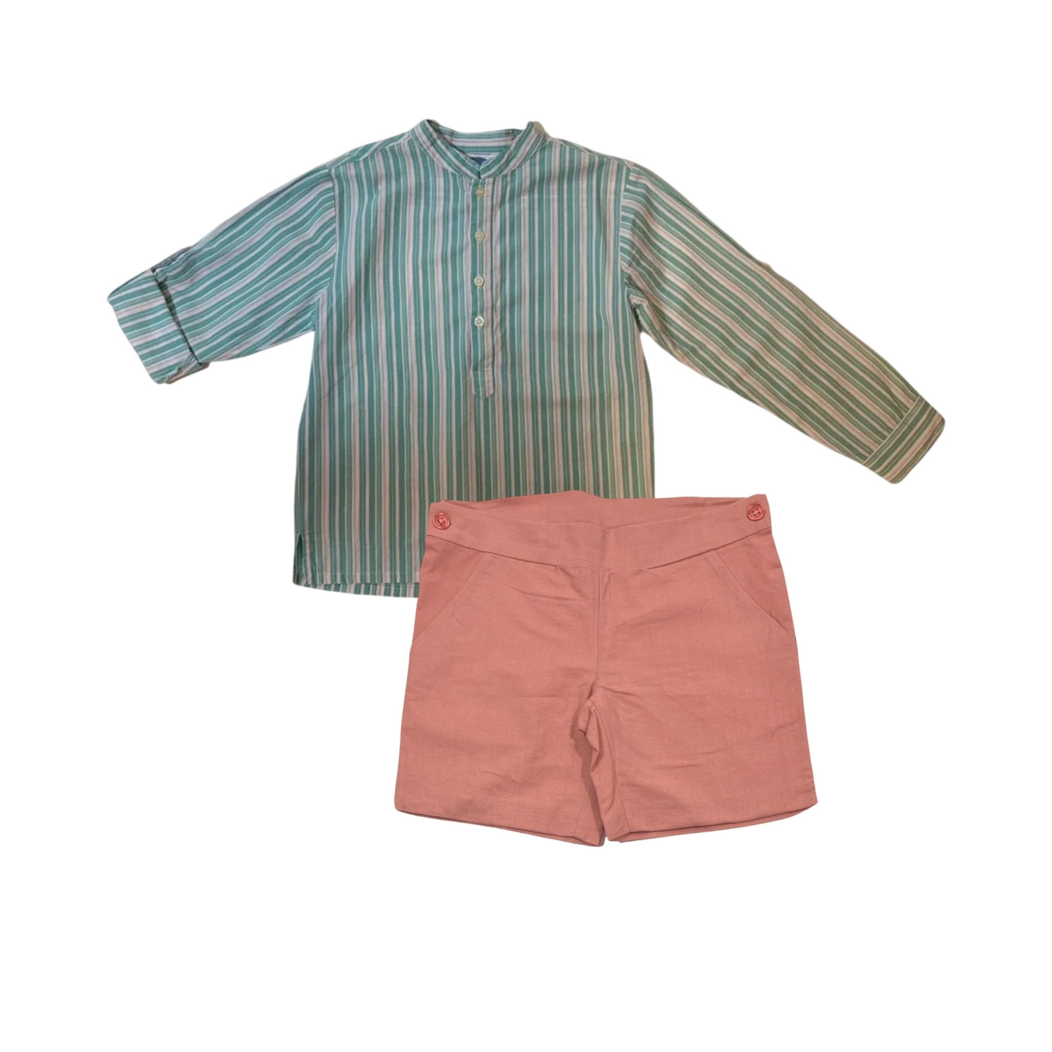 A beautiful mandarin collar button up by Patricia Mendiluce brings soft stripes and effortless charm, made in Spain with a look that feels both classic and fresh. Paired with La Ormiga red shorts in a cotton linen blend, fully lined and finished with side buttons and an adjustable waist, this set is easy and elegant.