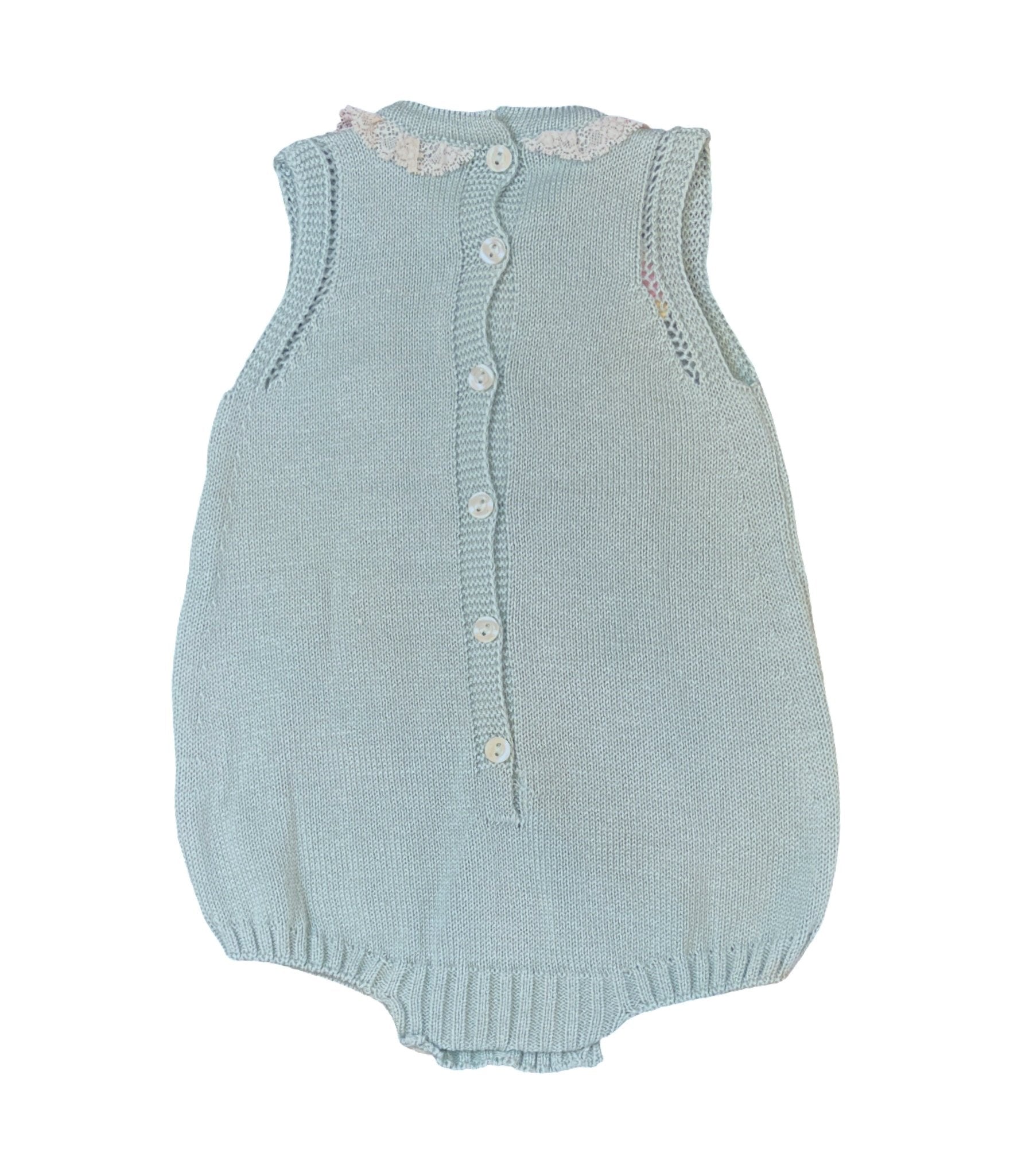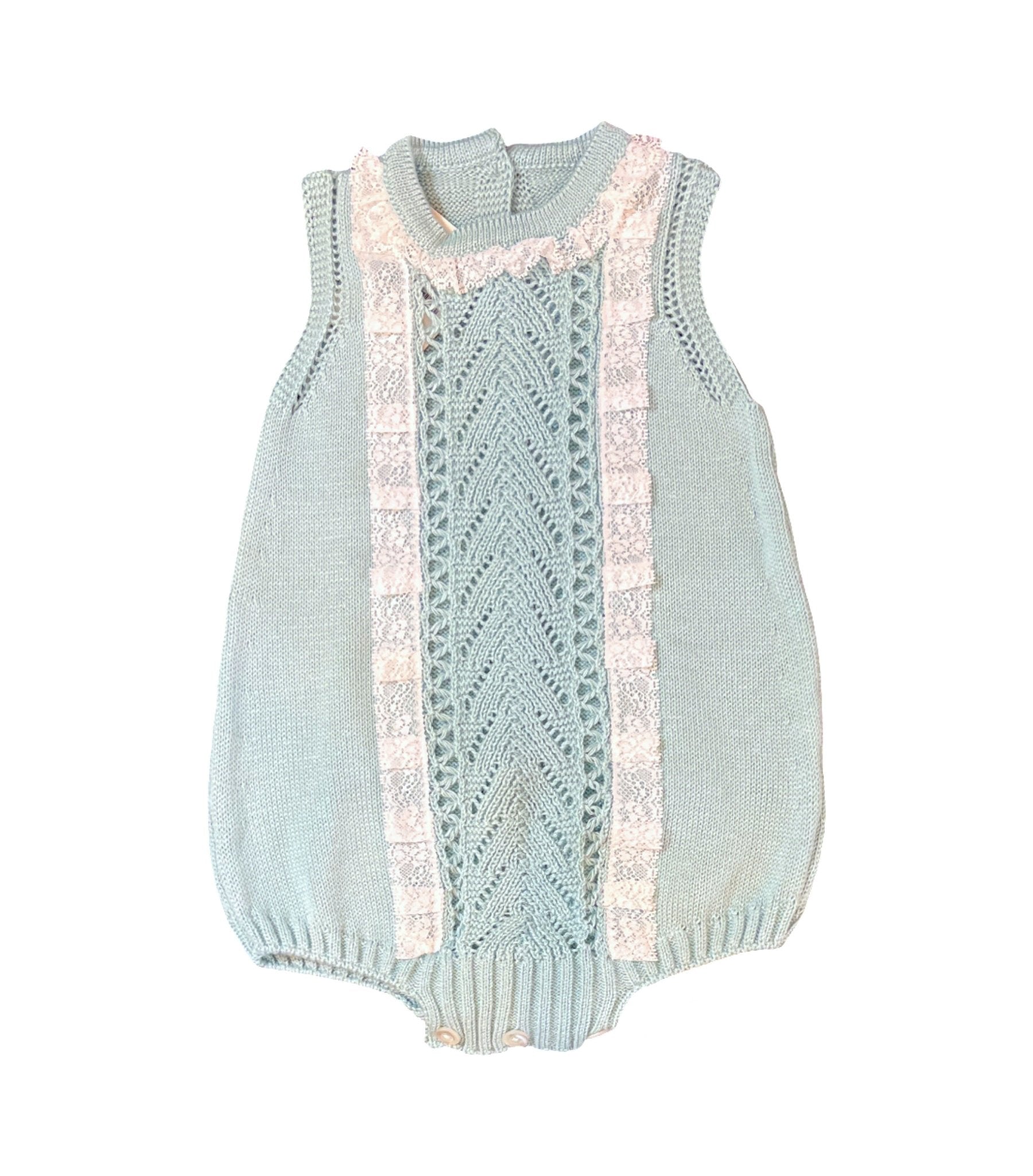 This charming romper by the Spanish brand Juliana is crafted from soft, lightweight cotton, offering both comfort and style for your little one. It features elegant white lace appliqués adorning the front and neckline, adding a touch of sophistication. The button-up closures at the bottom and back ensure an easy fit, making this an effortlessly stylish and practical choice for any occasion.
