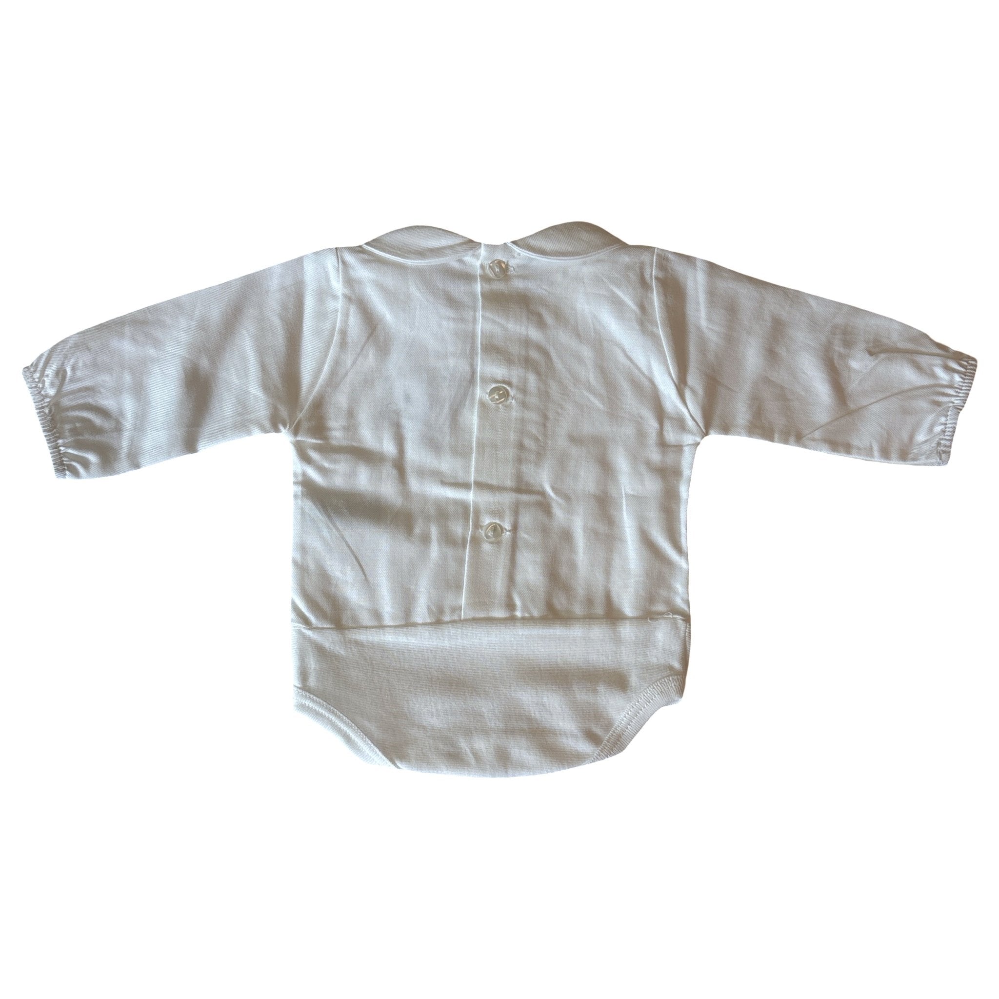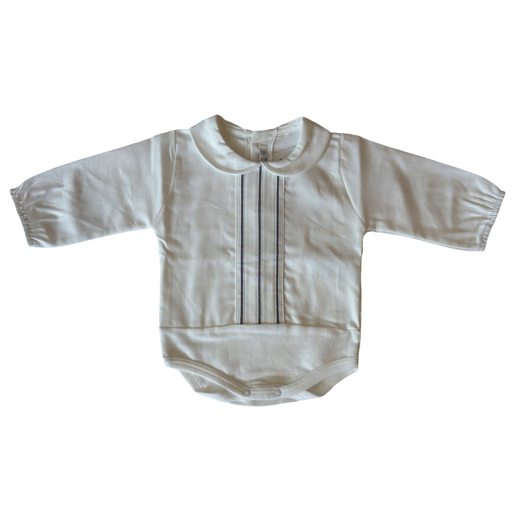 Refined and timeless, this Calamaro long-sleeve onesie is crafted from soft cotton for gentle comfort on delicate skin. The design features a crisp white base with a rounded Peter Pan collar and elegant vertical pinstripes in grey, adding a subtle hint of contrast.