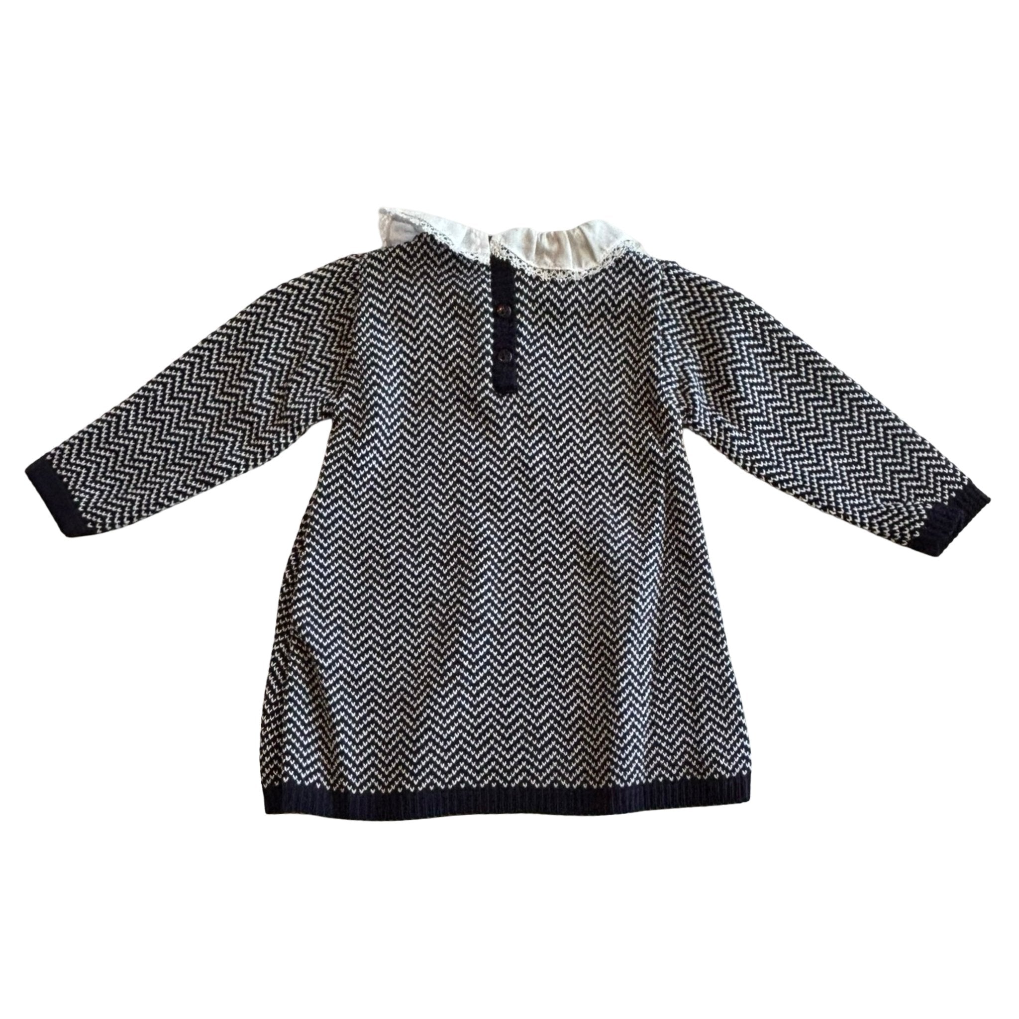 A soft blue knitted dress with Sardon’s signature crisp detailing — including gentle ruffles and refined lace trims. A sweet winter wardrobe favorite.